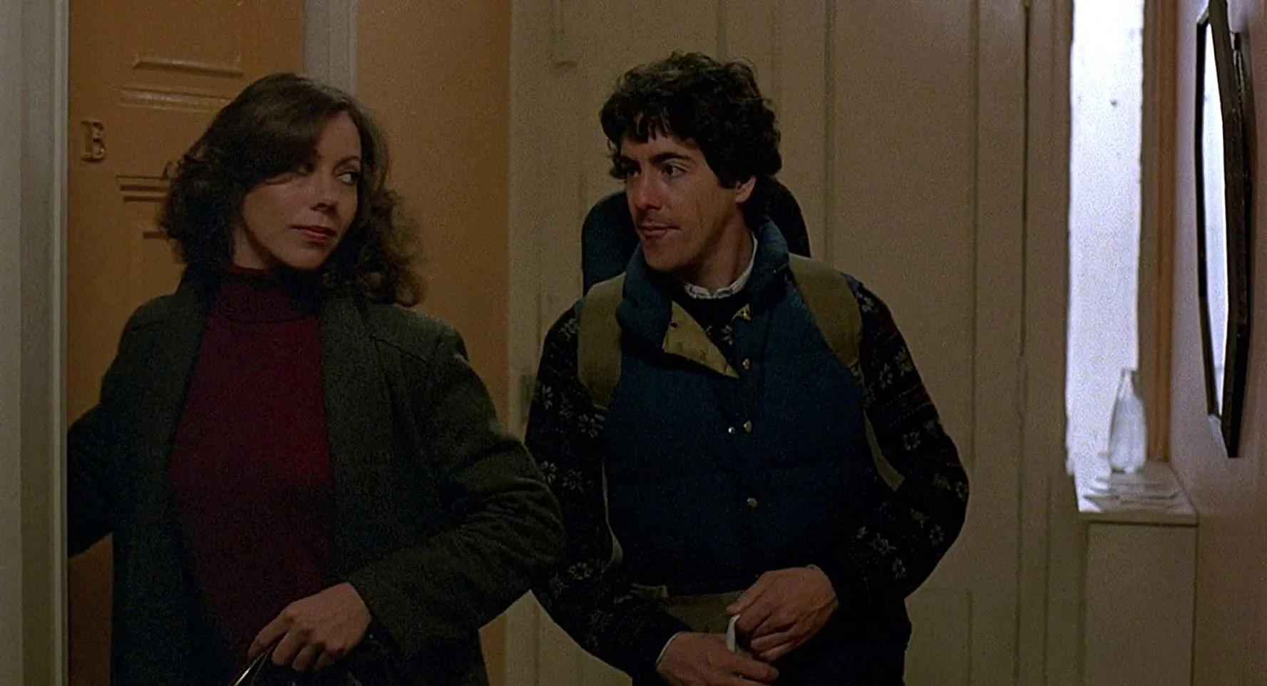 The film opens on two college boys hiking through the moors of northern England, joking about and all around having a good time, though David (David Naughton, “Detroit Rock City”) seems to be having a better time than Jack (Griffin Dunne, “After Hours”). The two boys happen upon a small hamlet and wander into a local pub, where they immediately sense their presence is unwanted. The locals tell them to clear off, and they do, only to be attacked by something on the morgue. Three weeks later, David wakes from a coma in a hospital in London to find that he is covered in scars. At night he begins experiencing strange and violent nightmares that make him believe he might turn into a werewolf on the next full moon. Is David going crazy, or is some sort of supernatural phenomena really happening in London?